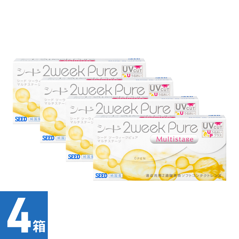 2ウィークピュアうるおいプラスマルチステージは、2週間交換タイプの遠近両用コンタクトレンズです。1日使い捨てタイプよりも経済的に、1か月交換タイプのレンズよりも衛生的に使うことができます。1箱には片目3か月分となる6枚入りです。